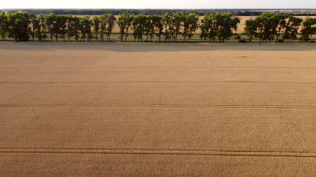 Aerial Drone View Flight Over Wheat Field with Ripening Yellow Wheat and Highway, Strip of Green Trees. Agrarian, Agricultural, agricultural field, agricultural culture crop. Agroindustrial industry