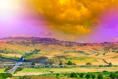 Landscape of Sicilian hills at sunrise. Asphalt road elevated by columns due of frequent earthquakes of the island of Sicily