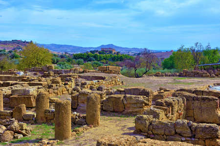 Ruins near the Temple of Castor and Pollux, which are a symbol of Agrigento, Valley of the Temples, Sicily.