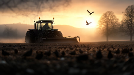 A peaceful early morning view of a tractor working in a plowed field, with birds soaring overhead and trees lining the horizon. A perfect depiction of rural life.