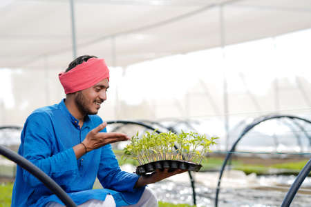 Young indian farmer at greenhouse or poly house