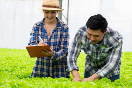 Two Asian couple farmers working in vegetables hydroponic farm with happiness. There are looking and using hands check the quality of green oaks and writing down some note. Business of healthy food.