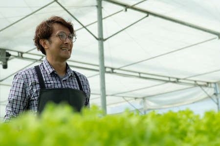 Young Asian farmer man working in vegetables hydroponic farm with happiness. He is looking and using hands check the quality of green oaks. Cultivation salad organic food. Business of healthy food.