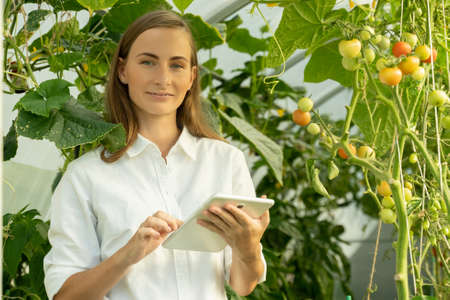 Woman farmer in a white shirt with a digital tablet in the greenhouse monitors the growth of tomatoes. Smart organic farm.