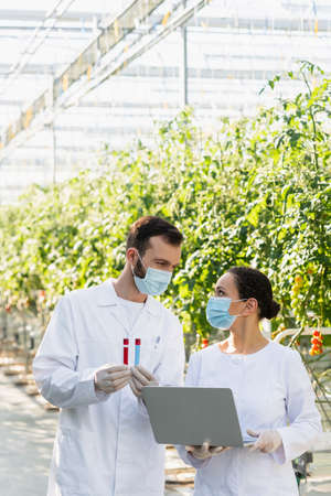 quality inspectors in medical masks holding test tubes and laptop in greenhouse