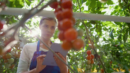 Agronomist using digital tablet for analysis of tomatoes plantation. Agriculture innovative technology concept