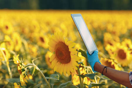 Woman farmer agronomist in gloves and face mask at sunflower field with tablet checking harvest.