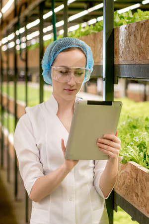 Young woman Biotechnologist using tablet to check quality and quantity of vegetable in hydroponic farm. Using technology to reduce working time and more comfortable. green salads in background