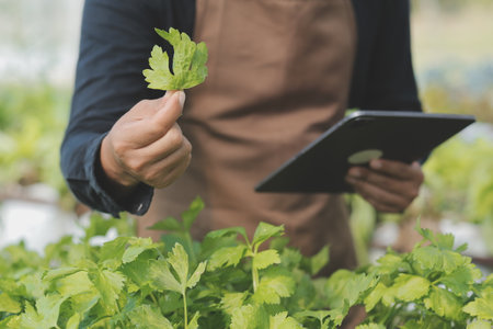 Organic farm ,Worker testing and collect environment data from bok choy organic vegetable at greenhouse farm garden.