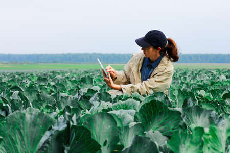 Farmer control quality of cabbage crop before harvesting. Woman agronomist using digital tablet and modern technology in agricultural field.