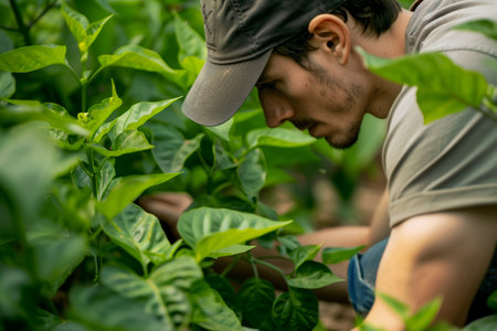 A Young Man Tending to Green Pepper Plants in a Lush Garden at Dusk