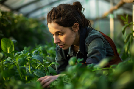A gardener tends to young green plants in nutrient rich soil during bright daylight nurturing growth in a flourishing garden.