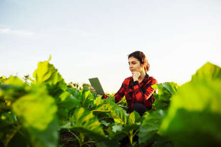 A young female farmer with a tablet in her hands examines the green field. An agronomist checks a field of young sunflowers. Woman in green field using specialized app