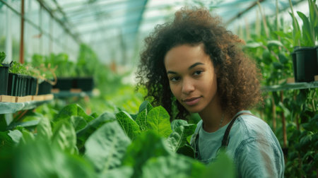 A Black female agronomist working in a greenhouse, organic vegetable and agriculture concept