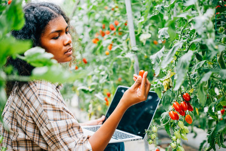 Farmer examines organic tomato quality in the greenhouse noting on laptop. Smiling portrait reflects expertise innovative farming and meticulous growth management.