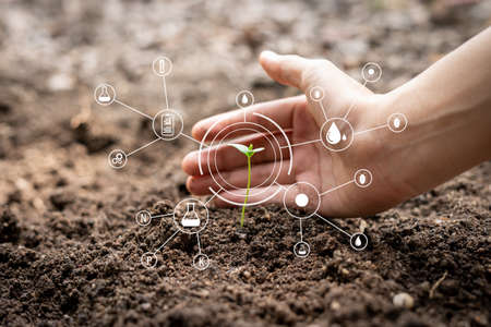 Gardeners' hands are embracing growing seedlings. And have digital mineral icon needed for growth. Agricultural concepts and technology, taking care of growth.