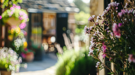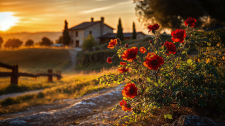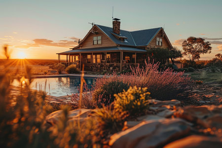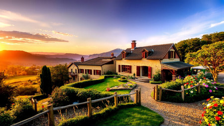 Beautiful sunset illuminates serene countryside home surrounded by vibrant flowers and lush greenery. warm light casts golden hue over landscape, creating peaceful and inviting atmosphere