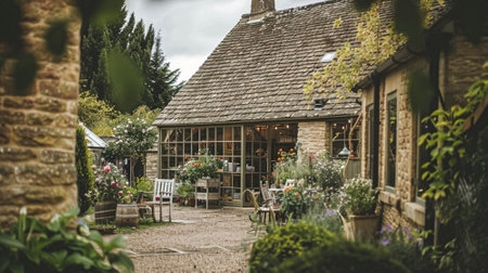 A Charming vintage cottage surrounded by lush greenery and sunlight