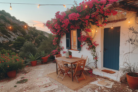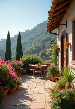 Sunny terrace surrounded by colorful flowers, invites relaxation, offering breathtaking view and cozy spot with table chairs. Terrace adorned with blooming flowers and scenic mountains. Generative AI