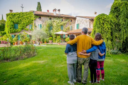 Back view of happy family hugging is standing outside their new house - This photo canuse for family, father, mother and home concept
