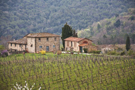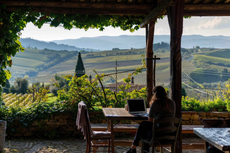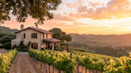AI Generated. Golden sunlight bathes a rustic farmhouse nestled among rolling vineyards in the serene countryside during the evening