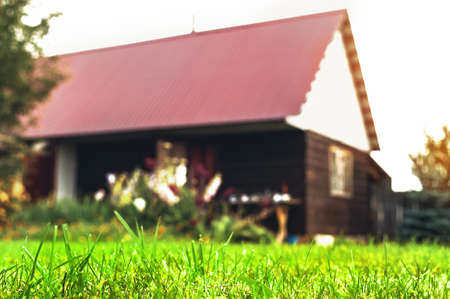 Low-Angle Close-Up of Mowed Green Grass Blades with Blurred Backyard Garden Shed or Outdoor Sauna in Background. Copy Space.