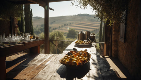 Rustic meal on wooden table, fresh summer fruit generated by artificial intelligence