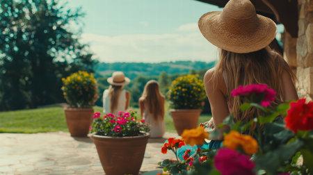 Three women seated outdoors in a beautiful garden filled with colorful flowers. They enjoy a sunny day with a stunning landscape view, embodying relaxation and friendship.