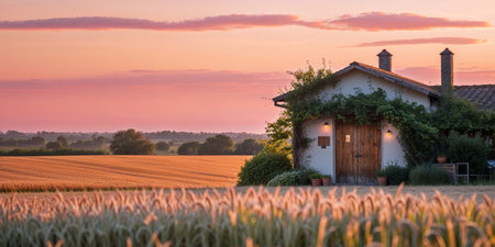 AI Generated. Serene Countryside Landscape with Cozy House and Golden Fields at Sunset