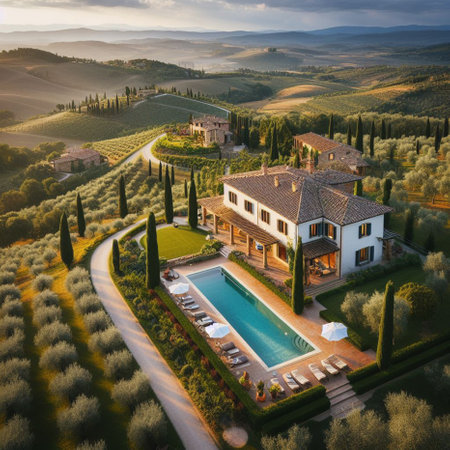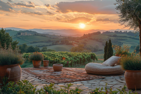 A rustic farmhouse stands amidst lush green vineyards as the sun sets, casting a warm glow over the rolling hills and creating a serene landscape perfect for relaxation.