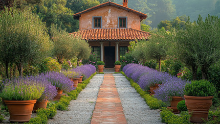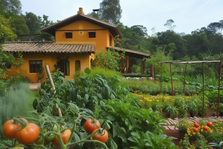 An idyllic rural farmhouse with a vibrant vegetable garden, showing sustainable living and organic farming.