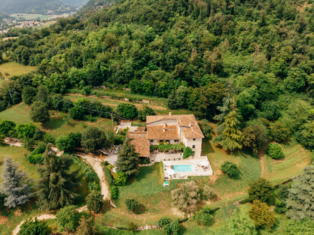 View from above of a farm in the Italian countryside (Marche, Italy, Europe)