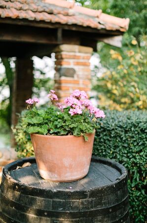 Clay pot with blooming geranium growing standing on an old barrel in the middle of the garden. Selective focus. Garden design concept