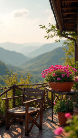 A picturesque balcony adorned with lush pink flowers invites tranquility, offering breathtaking views of rolling mountains in the distance. This idyllic scene captures the essence of peaceful living, where natures beauty harmonizes with cozy outdoor relaxation.