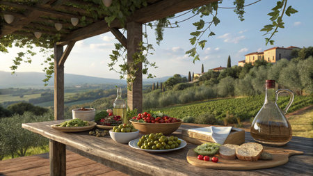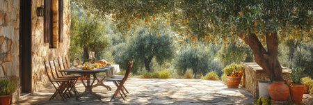 A charming outdoor dining area features a rustic table and chairs filled with fresh fruits. An ancient olive tree provides shade, enhancing the serene atmosphere.