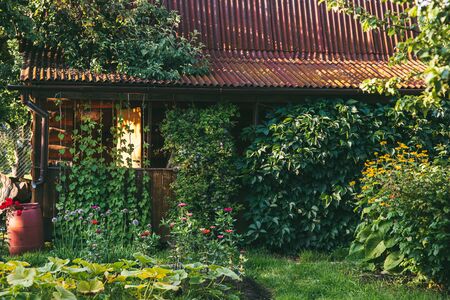 Virginia creepers plant or Parthenocissus quinquefolia Green hedge wraps around the entire wall and roof of a house in the garden
