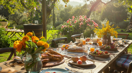 An outdoor dining table is laden with food and drinks, offering a panoramic view of a mountain range at sunset. The scene captures warm colors, with golden light illuminating the food and table settings. This image could be used for hospitality or travel publications or to illustrate concepts of leisure.