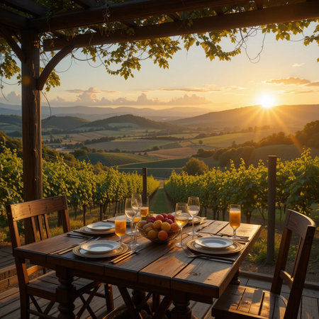 An elegantly set outdoor dining table with white plates, offering a breathtaking view of a picturesque vineyard landscape