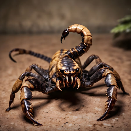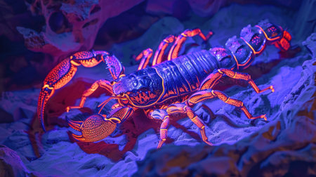 A vibrant scorpion with glowing patterns rests on sand, creating a striking contrast against the dark background. Ideal for nature and insect-themed projects.