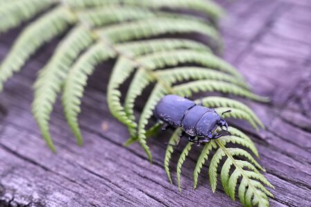 Lucanus cervus beetle with horns on fern leaf.