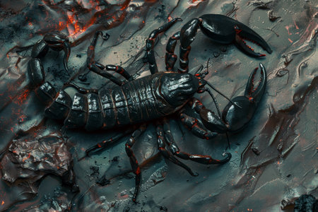 image of black scorpion on the wet ground.
