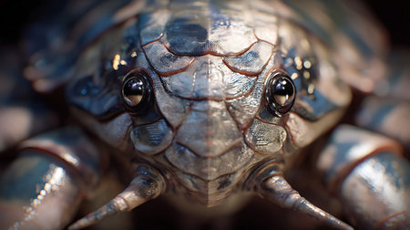 Macro shot of scorpion exoskeleton texture, rough, segmented surface with deep black and amber hues.