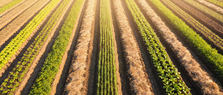 Aerial view of thriving agricultural fields featuring symmetric rows of lush green plants. This landscape highlights the beauty and productivity of nature.