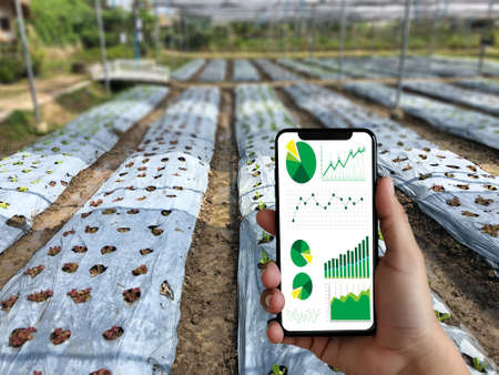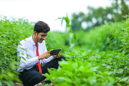 agriculture technology concept man Agronomist Using a Tablet in an Agriculture Field read a report