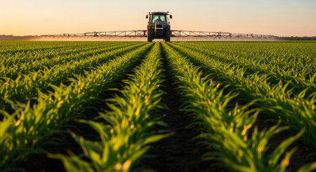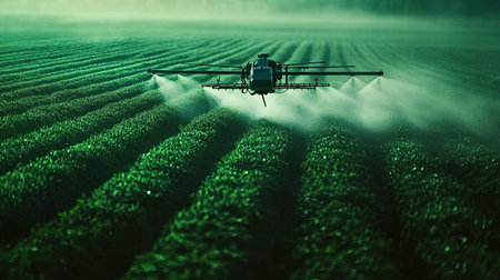 A modern agricultural machine sprays pesticide over vibrant green crops in a serene rural setting, enhancing productivity and sustainability in farming practices.