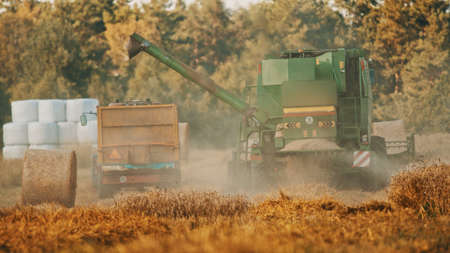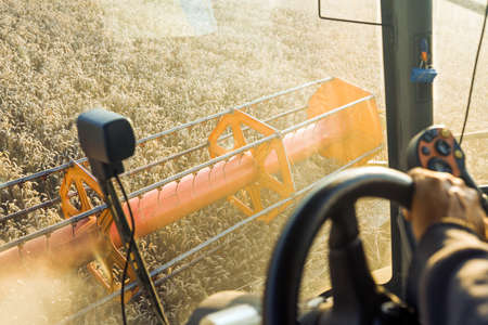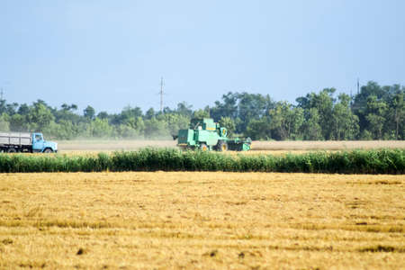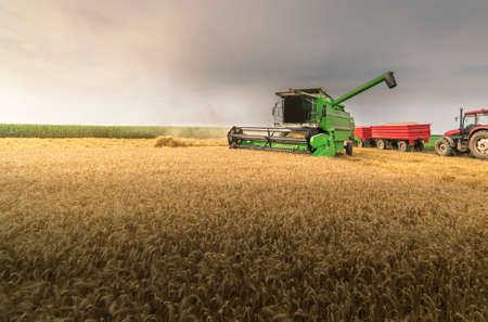 Combine harvester collecting golden wheat field, Harvesting machine working at agricultural field, Harvest reaping season