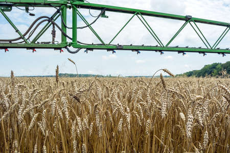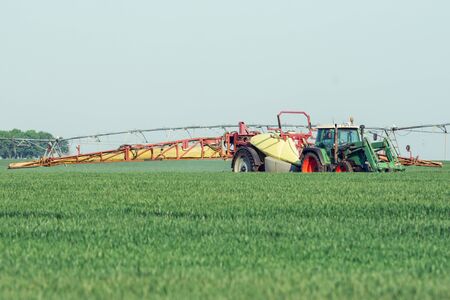 Skutec, Czech Republic, 17 May 2021: Pesticide spraying of young wheat in the field using a tractor sprayer.