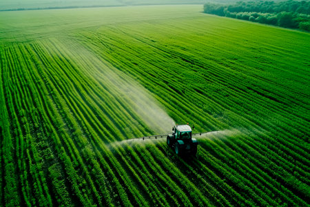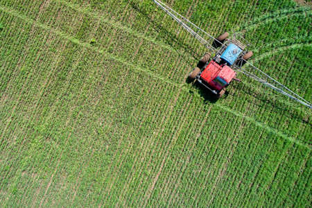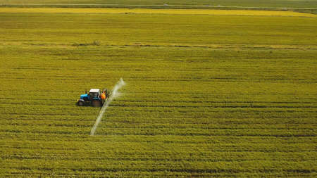 Aerial view tractor spraying the chemicals on the large green field. Spraying the herbicides on the farm land. Treatment of crops against weeds.