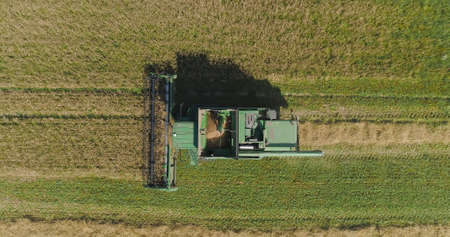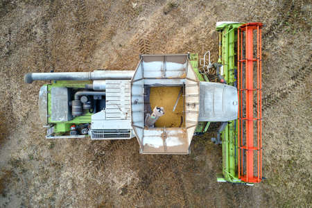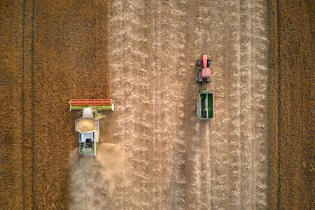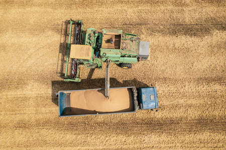 Beautiful harvester to truck clean ripe harvest in the farm field. Flat view from flight altitude