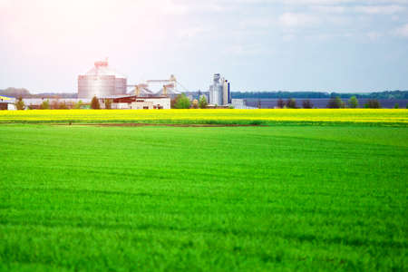 Agricultural Silos - Building Exterior, Storage and drying of grains, wheat, corn, soy, sunflower against the blue sky with rice fields.